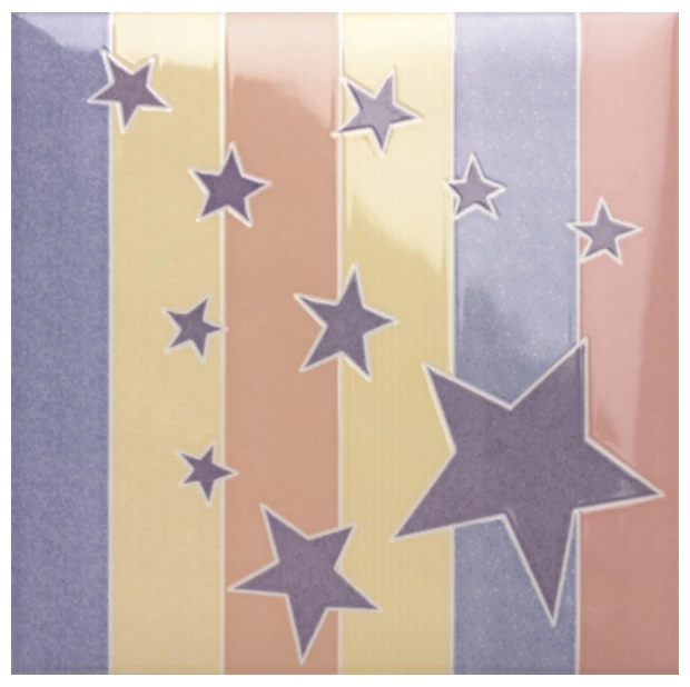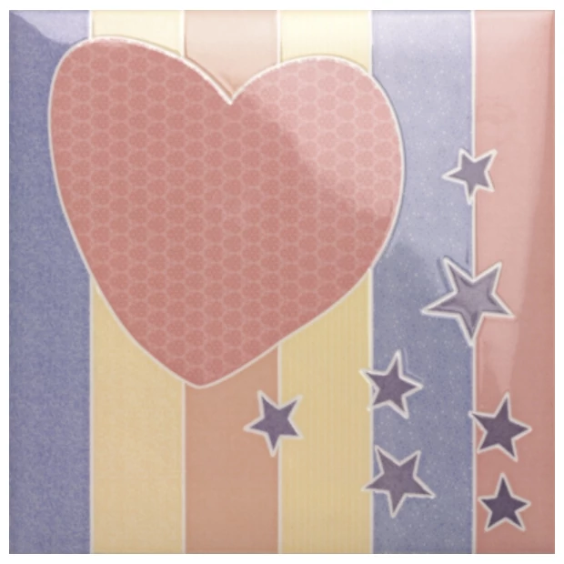 Kids Lignes dekor 20x20 to mała glazura dekoracyjna utrzymana w delikatnej, pastelowej kolorystyce. Płytka pokazuje kompozycję pionowych pasów w odcieniach różu, żółci oraz niebieskiego, które przeplatają się z motywem serca i rozrzuconymi gwiazdkami. Ten patchworkowy wzór sprawia, że płytka nie jest monotonny, a każdy element przyciąga uwagę osobnym detalem. Całość ma lekko błyszczącą powierzchnię, która dodatkowo podkreśla grafikę.