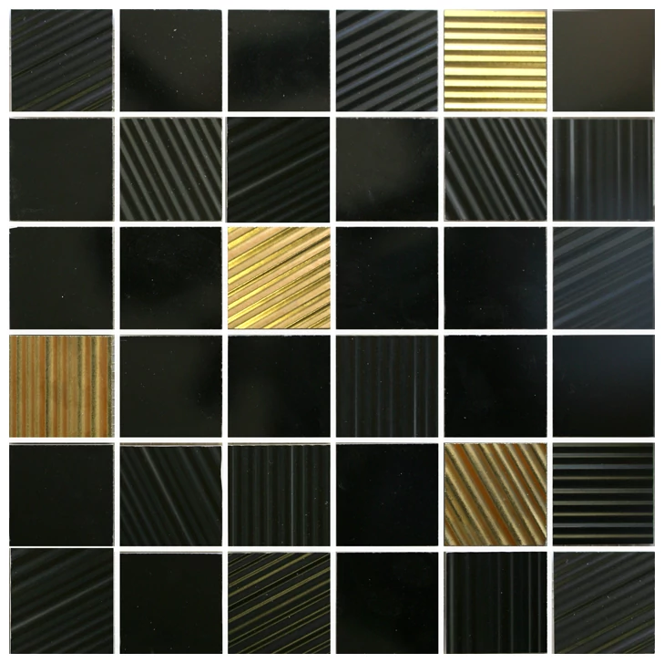 Noise Negro 5x5 to mozaika utrzymana w ciemnej, eleganckiej tonacji czerni z subtelnym połyskiem. Płytki mają wymiar 29,75x29,75 cm, co oznacza dość dużą powierzchnię pojedynczych elementów, idealną do wyrazistego wykończenia ścian. Na szczególną uwagę zasługują różnorodne faktury - od gładkich powierzchni po płyty z ukośnymi żłobieniami, niektóre z nich ozdobione są zdecydowanymi, złotymi pasami. Kontrast pomiędzy matową czernią a błyszczącymi, metalicznymi detalami dodaje dynamiki, a przede wszystkim podkreśla styl glamour, dzięki któremu wnętrze nie będzie wyglądać płasko czy monotematycznie.