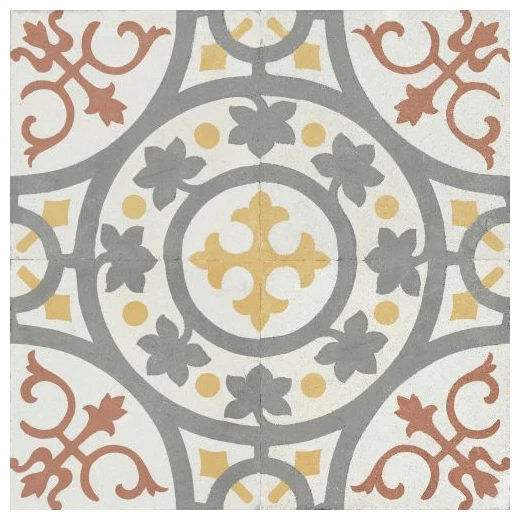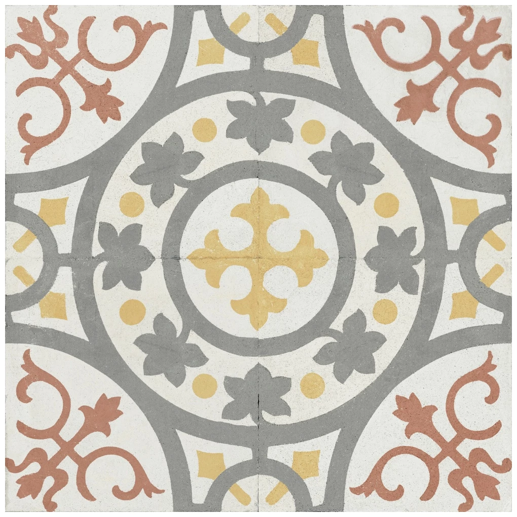 Płytka FS Paname Trocadero to przykład klasycznej, hiszpańskiej terakoty podłogowej, która mocno nawiązuje do stylistyki retro. Jej wzór oparty na geometrycznych i roślinnych motywach w odcieniach czerwieni, szarości oraz żółci układa się na matowej powierzchni o wymiarach 45x45 cm. Ten rozmiar należy do kategorii dużych płytek, co sprawia, że wzór jest wyraźny i przyciąga wzrok, ale jednocześnie nie dominuje przesadnie przestrzeni. Patrząc na tę płytkę, dostrzega się wyważoną równowagę między detalem a ładem - kontury są wyraźne, lecz nie nazbyt ostre, co doskonale wpisuje się w estetykę vintage.