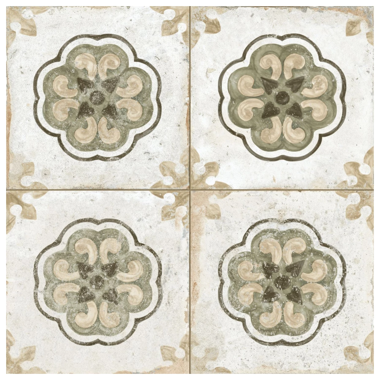 Projekt jest dokładnie przemyślany - ornament umieszczony centralnie na płytce w kolorach zgaszonej zieleni i beżu podkreśla naturalność i rustykalność. Kątowe detale korespondują z głównym motywem, tworząc spójną całość, ale z wyraźnym rytmem podziału. To nie jest kolejny banalny wzór - każdy element ma swoje miejsce i sens.