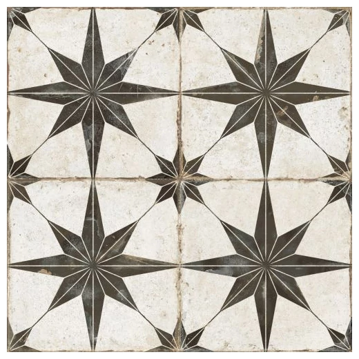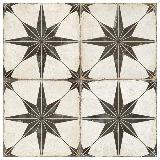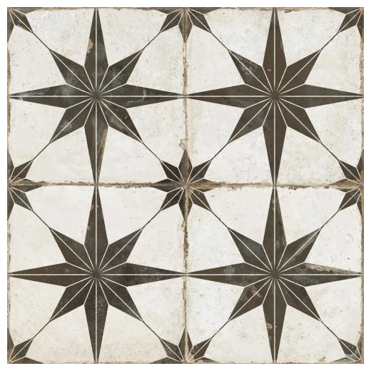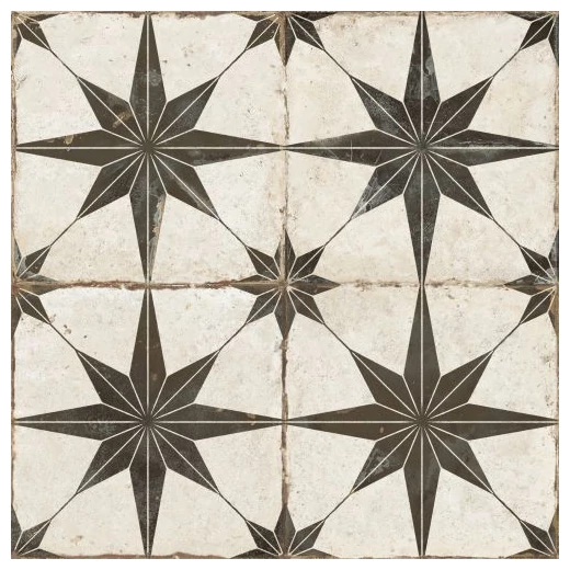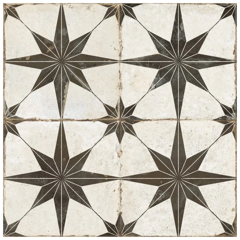 FS Rockstar-N AS to hiszpańska płytka podłogowa o wymiarach 45,2 x 45,2 cm. Na pierwszy rzut oka zauważalny jest wyraźny wzór przypominający gwiazdę, ułożoną na białym tle z delikatnymi, nierównymi przetarciami i celowym postarzeniem. Czarny motyw jest geometryczny i wyraźny, lecz jego nierówności na powierzchni wprowadzają rustykalny charakter. Całość ma wykończenie matowe, które podkreśla naturalny charakter materiału i eliminuje refleksy świetlne. Nie jest to klasyczna płytka gładka czy błyszcząca, ale taka, która na pewno zwróci uwagę, nadając wnętrzu wyrazistości.