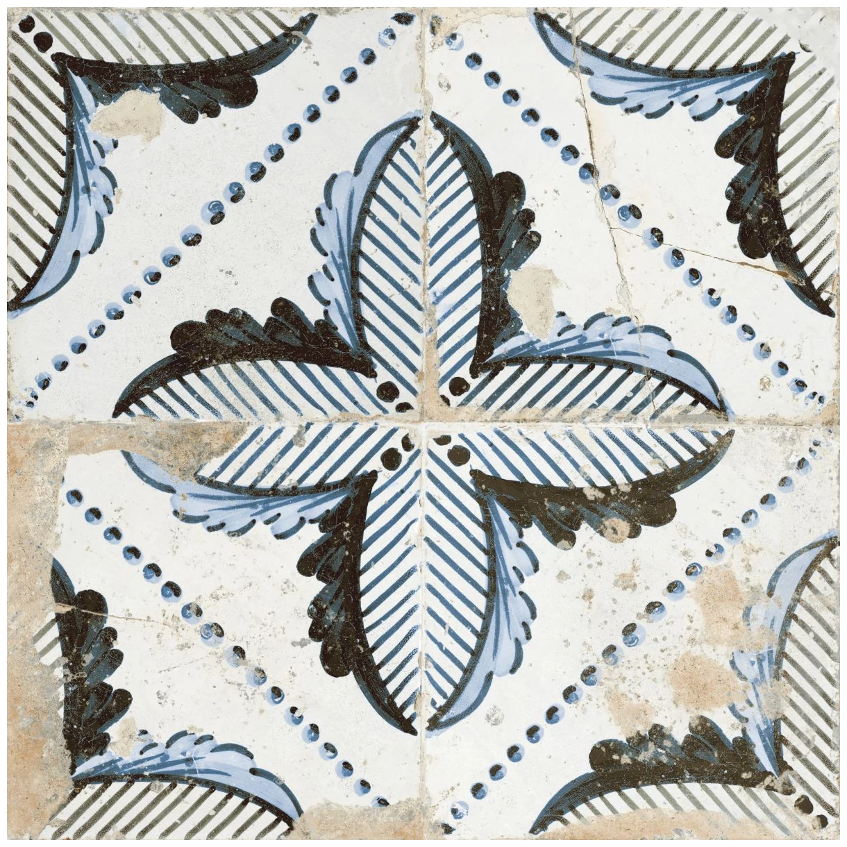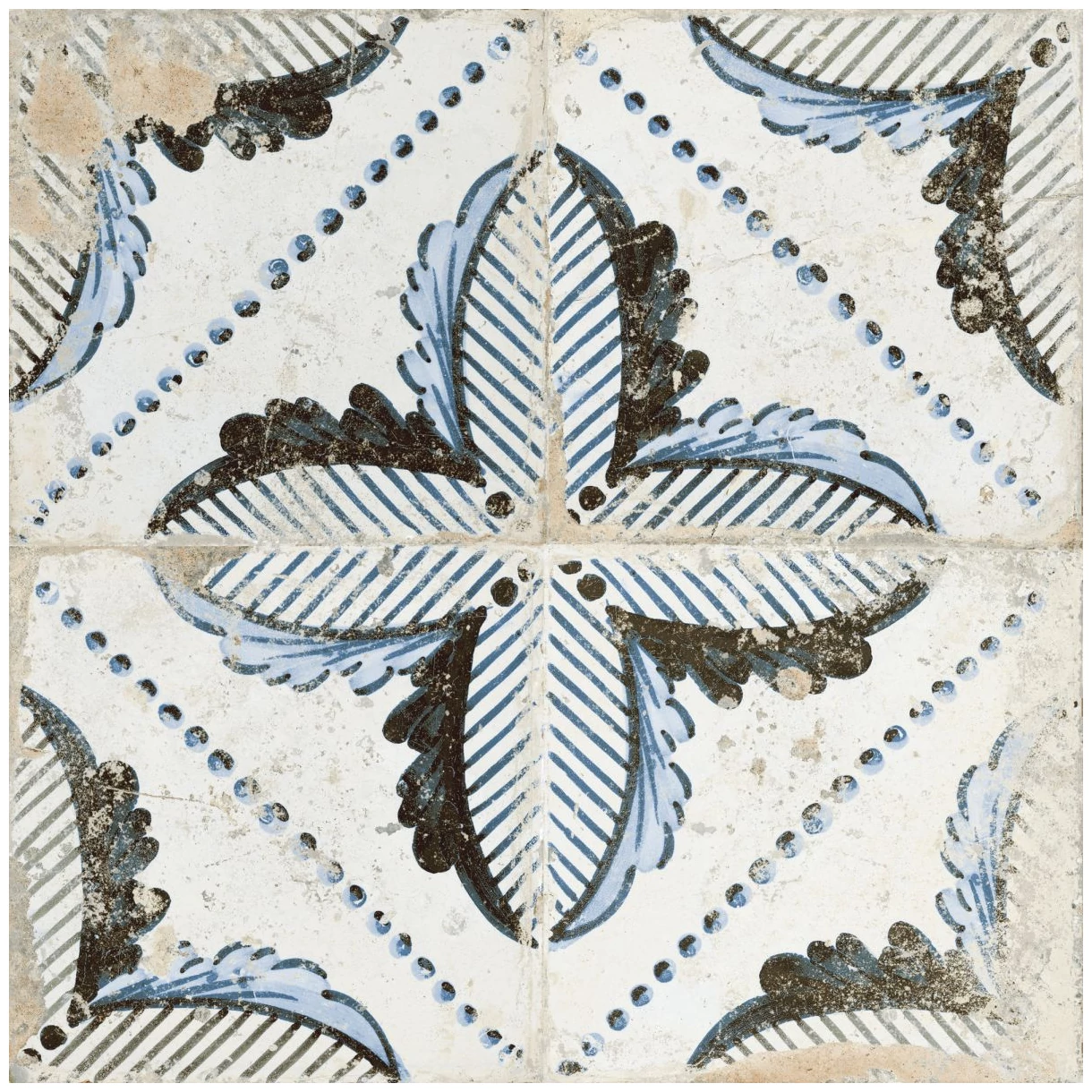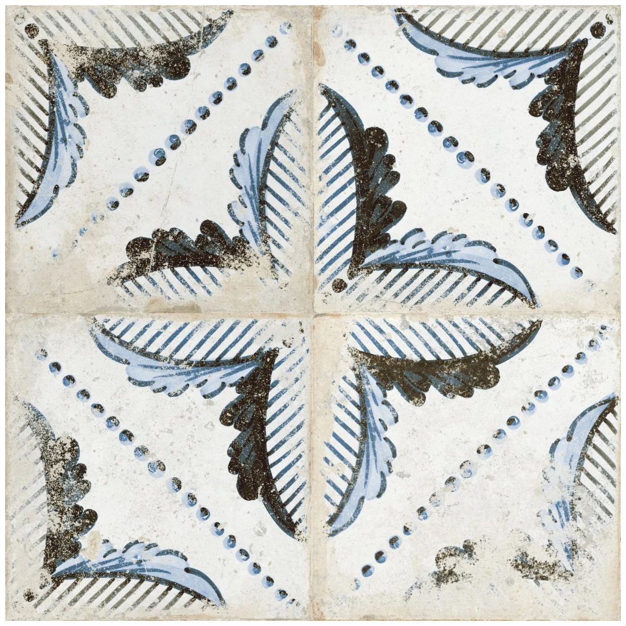 FS Roots 2 to płytka podłogowa o wymiarach 45x45 cm, która natychmiast przyciąga uwagę swoim wzorem i wykończeniem. Dominujący motyw to wyraźny liść z zaokrąglonymi kształtami, na tle białym z subtelnymi, matowymi detalami w odcieniach niebieskiego i czerni. Detale wzoru są wyraziste, ale nie przesadzone, co podkreśla rustykalny charakter płytki hiszpańskiej. Estetyka produktu może przywoływać odczucia autentyczności i naturalnej struktury popularnej w tradycyjnych wnętrzach.