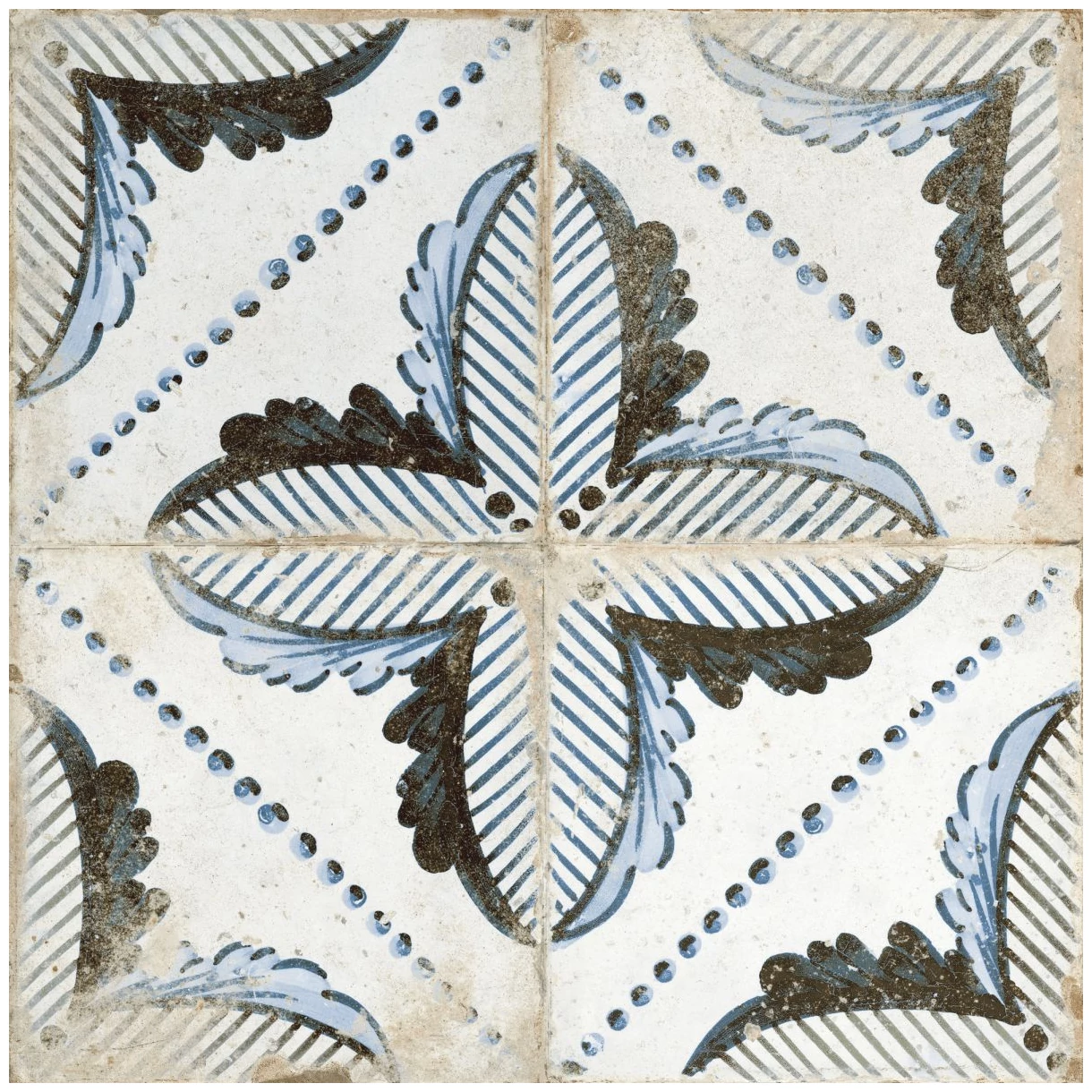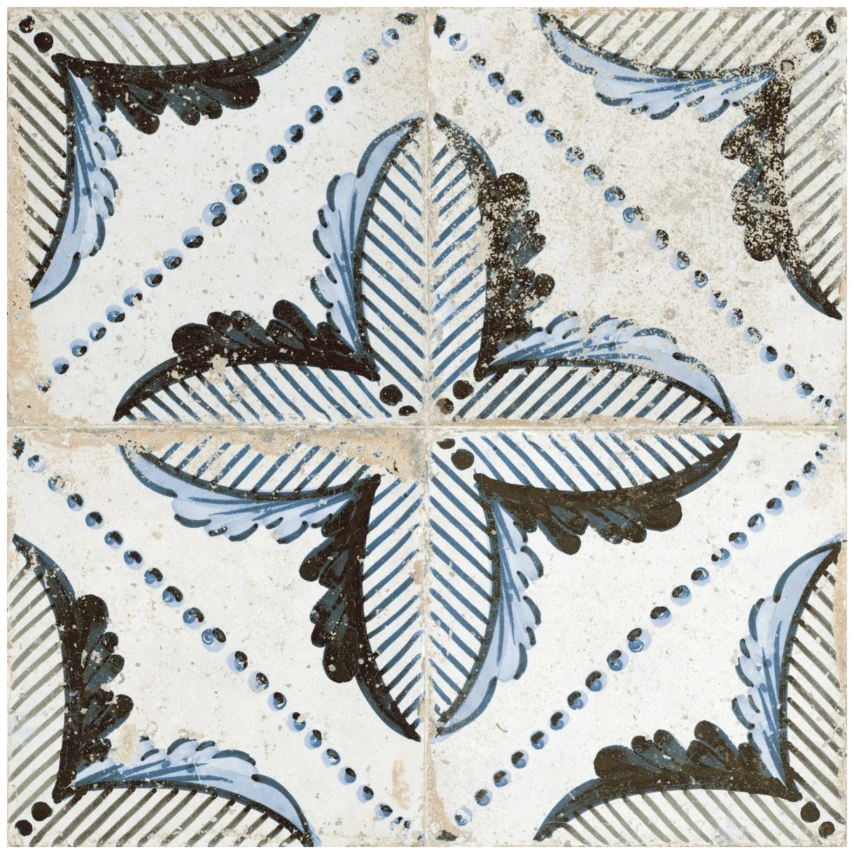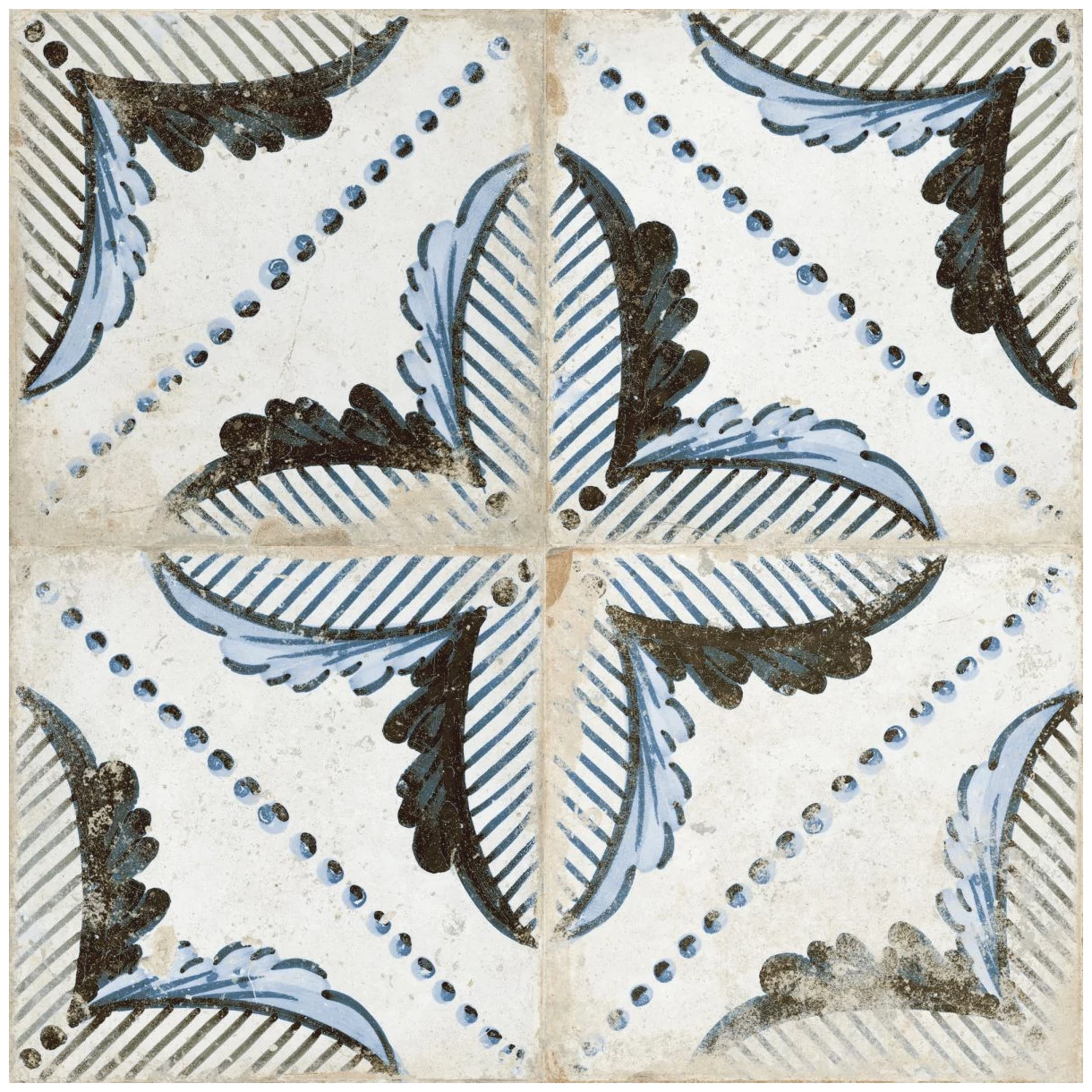 FS Roots 2 to płytka podłogowa o wymiarach 45x45 cm, która natychmiast przyciąga uwagę swoim wzorem i wykończeniem. Dominujący motyw to wyraźny liść z zaokrąglonymi kształtami, na tle białym z subtelnymi, matowymi detalami w odcieniach niebieskiego i czerni. Detale wzoru są wyraziste, ale nie przesadzone, co podkreśla rustykalny charakter płytki hiszpańskiej. Estetyka produktu może przywoływać odczucia autentyczności i naturalnej struktury popularnej w tradycyjnych wnętrzach.