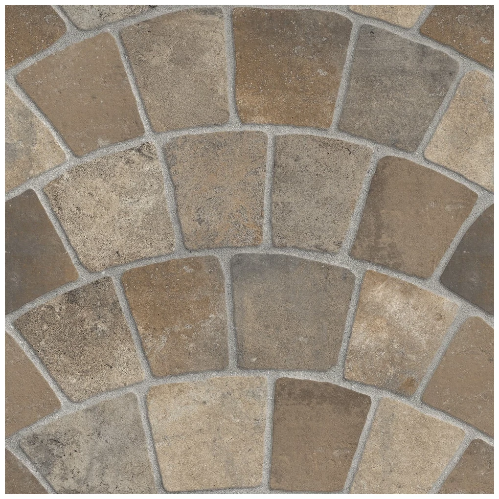 Płytka Alcazar Sage to gres podłogowy o wyraźnym, kamiennym efekcie powierzchni, który imituje autentyczne, naturalne ułożenie kamieni. Kolory są stonowane, ziemiste - dominują beże i brązy z delikatnymi przejściami tonalnymi, co nadaje powierzchni głębię i naturalność. Wzór składa się z nieregularnych kształtów kamieni, rozmieszczonych w półokrągłe łuki, które mogą wprowadzić ciekawy detal architektoniczny do przestrzeni.