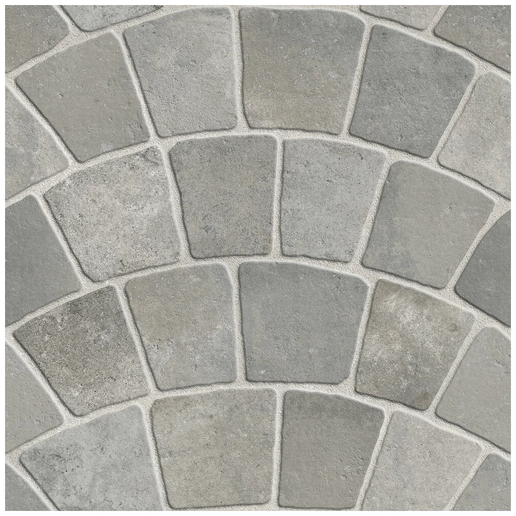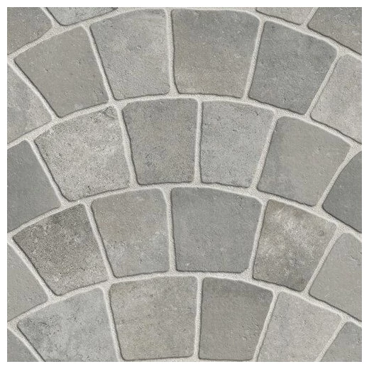 Alcazar Gris to płytka tarasowa o wymiarze 60x60 cm, zaprojektowana z myślą o imitacji kamienia - naturalnego i stonowanego. Wzór układa się w łuki złożone z kamieni o różnych odcieniach szarości, co tworzy ciekawą, nieregularną powierzchnię wizualną, przypominającą brukowany chodnik czy starannie ułożony kamień naturalny.