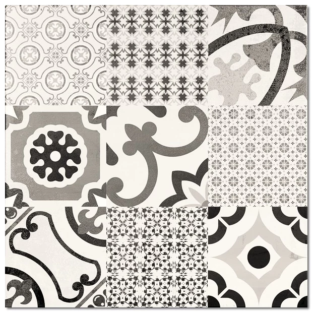 Płytka patchworkowa Logos JET Negro o wymiarach 58x58 cm wyróżnia się wyrazistym i zróżnicowanym wzorem składającym się z 9 różnych motywów. Każdy fragment ma unikalny rysunek, utrzymany w tonacjach szarości, czerni oraz bieli. Powierzchnia matowa eliminuje refleksy, co sprzyja subtelniejszemu efektowi i łatwiejszej integracji z różnymi aranżacjami wnętrz. Ten duży format daje możliwość stworzenia spójnej, ale zarazem interesującej podłogi, która nie będzie monotonna.