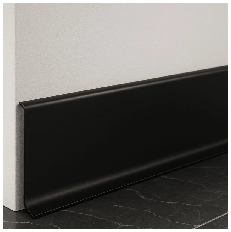 Widać precyzyjne dopasowanie do powierzchni ściany i podłogi. Powierzchnia jest jednolicie czarna, bez połyskliwych refleksów, co sprawia, że listwa dobrze komponuje się z nowoczesnymi wnętrzami oraz ciemnymi okładzinami podłogowymi.