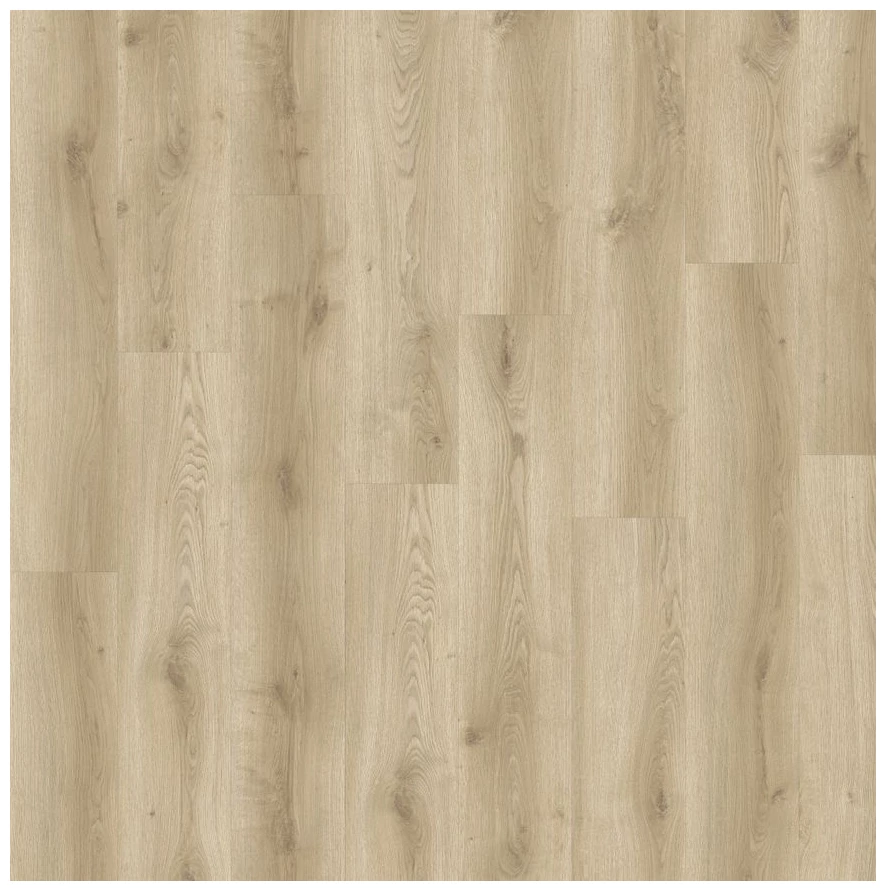 Jasny odcień przypominający naturalny dąb, widoczne rysunki słojów i pojedyncze sęki - to pierwsze, co zwraca uwagę. Panele układają się w prosty, uporządkowany układ desek, dzięki czemu powierzchnia wygląda spójnie, a jednocześnie nie jest monotonna. Kolorystyka jest stonowana, ciepła, pasuje zarówno do jasnych, jak i bardziej kontrastowych aranżacji.