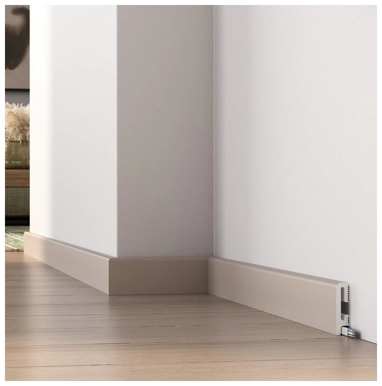 Prosty, neutralny kolor cappuccino, który nie przytłacza wnętrza. Powierzchnia wygląda na matową, bez mocnego połysku, co sprawia, że listwa dyskretnie wtapia się w przestrzeń. Krawędzie są wykończone równo, linia frontu jest niska i bez zbędnych zdobień.