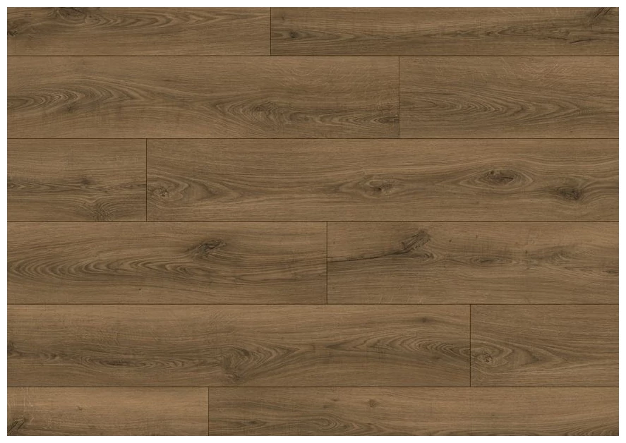 Naturalny, ciepły odcień brązu o wyraźnej, ale stonowanej fakturze słojów i sęków. Deski układają się w regularne pasy, tworząc spokojną, ale wyrazistą powierzchnię podłogi - widoczne rysunki drewna dodają charakteru bez przesady. Kolor pozostaje neutralny: ani zbyt ciemny, ani zbyt rudy, łatwo dopasowuje się do różnych stylów wnętrz.