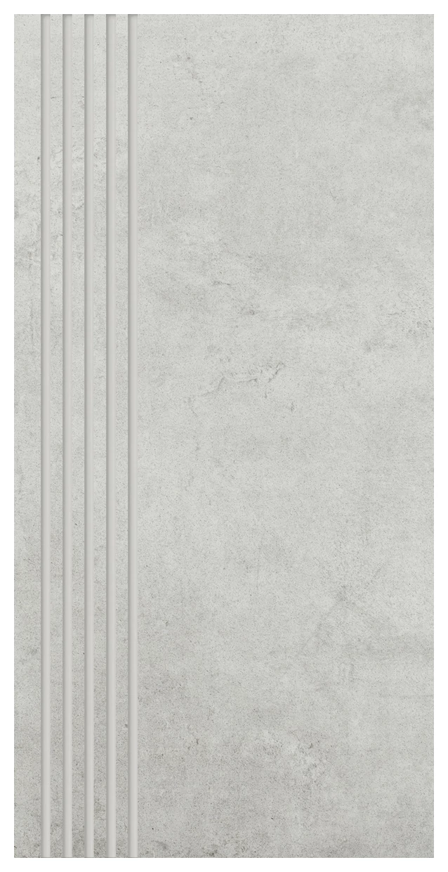 Stopnica gresowa imitująca beton antypoślizgowa Paradyz z kolekcji Scratch prezentuje uniwersalny, stonowany odcień szarości, który przywodzi na myśl surową, betonową powierzchnię. Powierzchnia jest matowa i niejednorodna w odcieniu, co pozwala na zminimalizowanie efektu zabrudzeń oraz nadaje produktowi autentycznego charakteru. Z lewej strony widoczne są charakterystyczne, równoległe rowki, które pełnią funkcję antypoślizgową, a jednocześnie dzielą materiał na części i wzmacniają jego praktyczny wymiar.