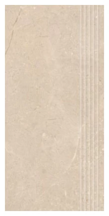 Sunnydust Light Beige to stopnica gresowa, która prezentuje się w delikatnym beżowym odcieniu. Jej powierzchnia jest matowa, co sprawia, że płytka wygląda naturalnie i nie odbija światła. Delikatne, nieregularne wzory przypominające kamień dodają subtelnej faktury. Po prawej stronie stopnicy widoczne są nacięcia zabezpieczające, które wpływają na bezpieczeństwo użytkowania, zwłaszcza na schodach.