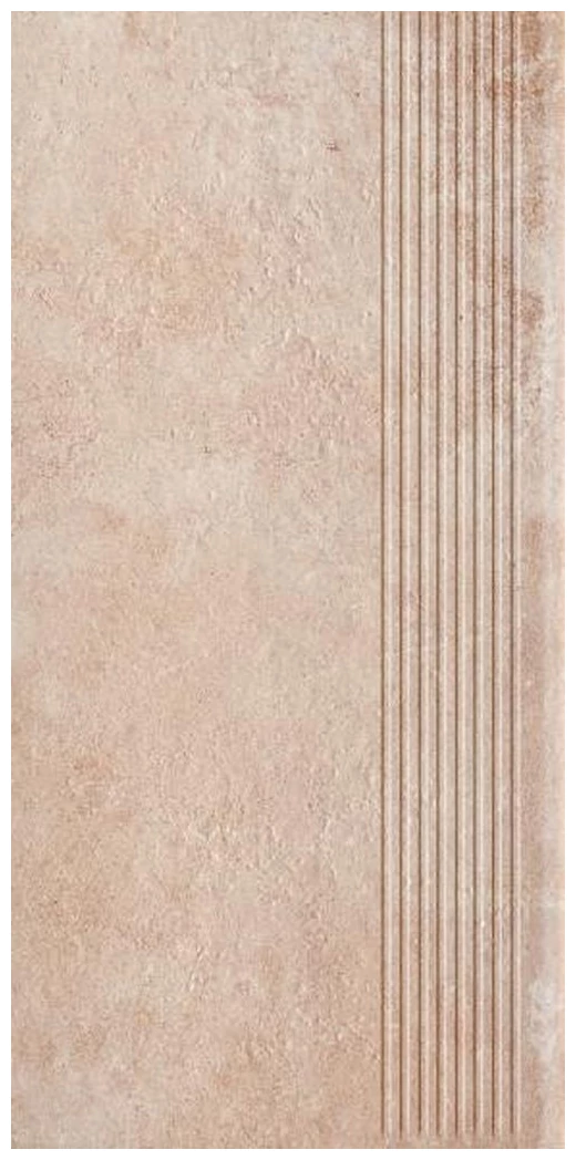 Stopnica Scandiano Ochra Prosta 30x60x0,85 ma kamieniopodobny wygląd, który przypomina naturalne materiały, ale jest bardziej wytrzymała. Powierzchnia jest matowa i strukturalna, co dodaje jej surowości i konkretnych cech. Detal w postaci równych, subtelnych żłobień po jednej stronie stopnicy tworzy wyraźną, niemal techniczną linię oddzielającą gładką część od krawędzi. Kolor utrzymany jest w ciepłej ochrowej tonacji, która nie jest przesadnie intensywna - można powiedzieć, że nie rzuca się w oczy, a raczej stonowanie podkreśla fakturę kamienia.