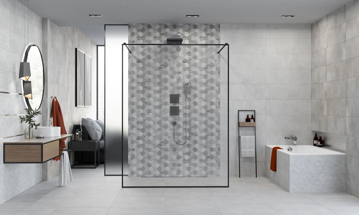 Szara glazura betonopodobna z tej serii charakteryzuje się też matową powierzchnią, co wpływa na mniejszą śliskość i przyjemność w dotyku oraz estetykę bez połysku. Strukturalny wzór sześciokątów to mniej typowy motyw w glazurze ściennej, co sprawia, że wnętrze zyskuje oryginalny, ale nie nachalny detal.
