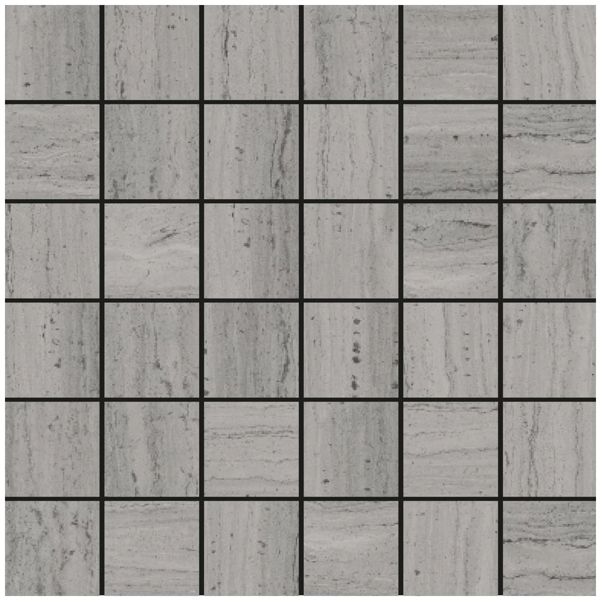 Produkt Marbox Serpentine 5x5 to mozaika o szarym kolorze, utrzymana w stylu retro. Poszczególne elementy układają się w siatkę, tworząc jasne, matowe płytki o nieregularnych, ale delikatnych wzorach, przypominających naturalny kamień. Szarość jest zdecydowanie chłodna i stonowana, niejednolita, co nadaje całości autentycznego, kamiennego efektu powierzchni. Kafelki są dość spore, każdy o wymiarze 29,75x29,75 cm, z wyraźnym, ale naturalnym rysunkiem.