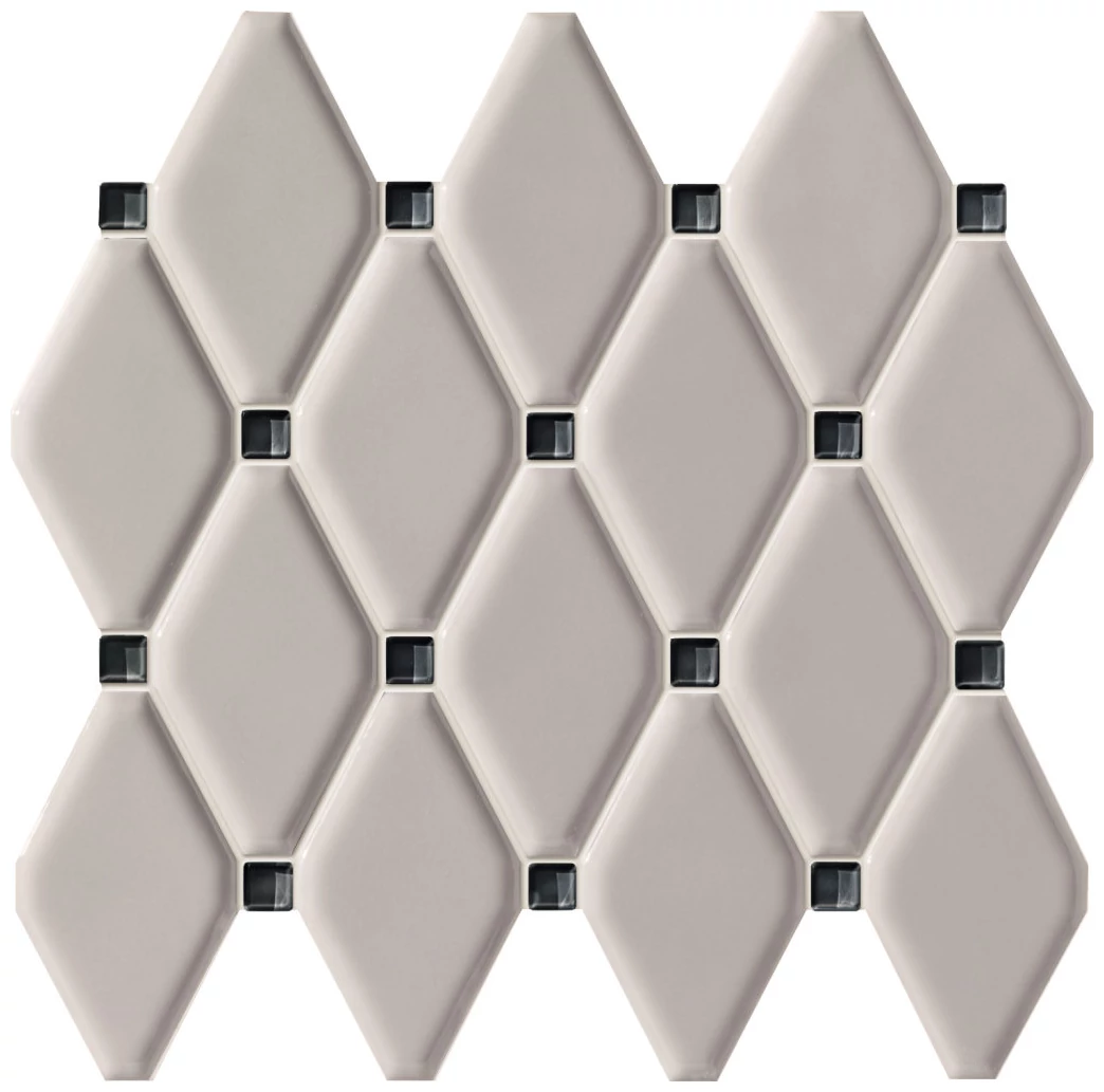 Abisso Grey to szara mozaika strukturalna łazienkowa i kuchenna o dużych rozmiarach 29,8x27 cm. Płytki mają powierzchnię błyszczącą, co natychmiast zwraca uwagę, szczególnie gdy światło pada pod różnym kątem. Warto zauważyć, że każdy element ma wyraźne krawędzie i delikatne zaokrąglenia, a czarne kwadraty w miejscach łączeń dodają dodatkowej dynamiki całej kompozycji.