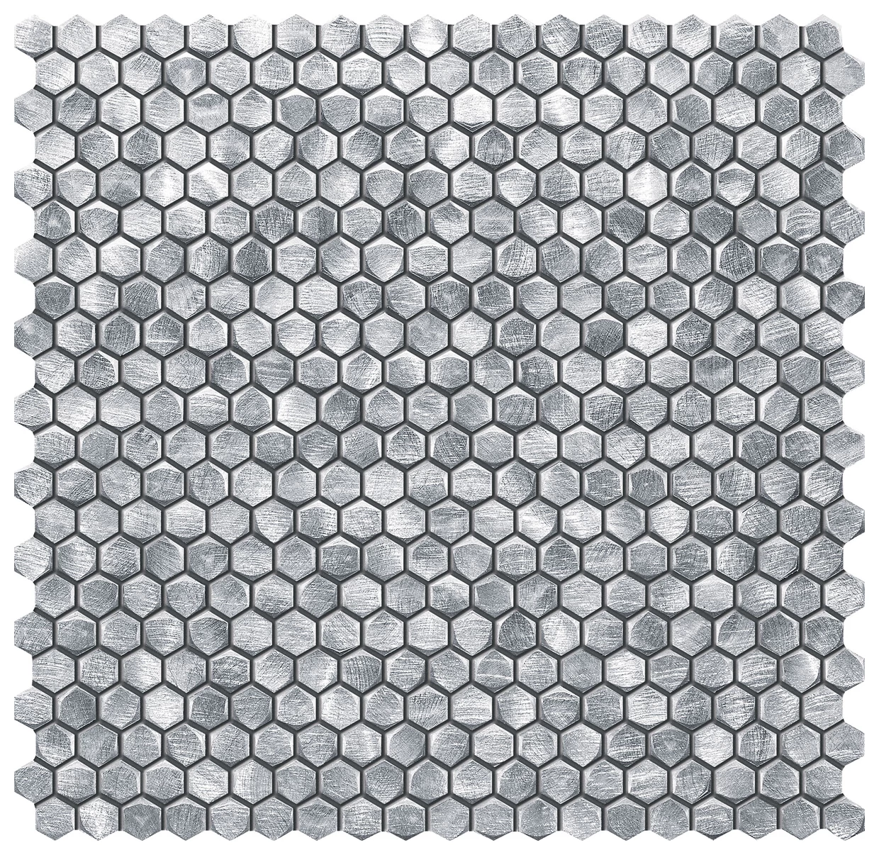 Mozaika Drops Metal Silver HEX o wymiarach 30x30,2 cm to szara mozaika z efektem 3D, która zwraca uwagę swoją trójwymiarową strukturą i matową powierzchnią. Sześciokątne elementy ułożone są ciasno, tworząc regularny wzór, który jednak dzięki naturalnym nierównościom powierzchni zyskuje surowy, industrialny charakter. Metaliczny odcień szarości jest podkreślony przez delikatne faktury, które imitują szczotkowane aluminium lub stal.