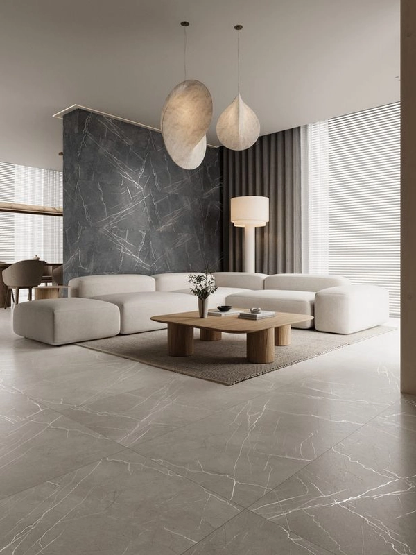 Szary, kamieniopodobny motyw działa neutralnie względem różnych stylów: od nowoczesnych, poprzez oszczędne skandynawskie zestawienia, aż po bardziej surowe, minimalistyczne realizacje. Duży format optycznie powiększa przestrzeń, płytki nie narzucają wzoru, lecz dają wyraźne, uporządkowane tło dla mebli i dodatków.
