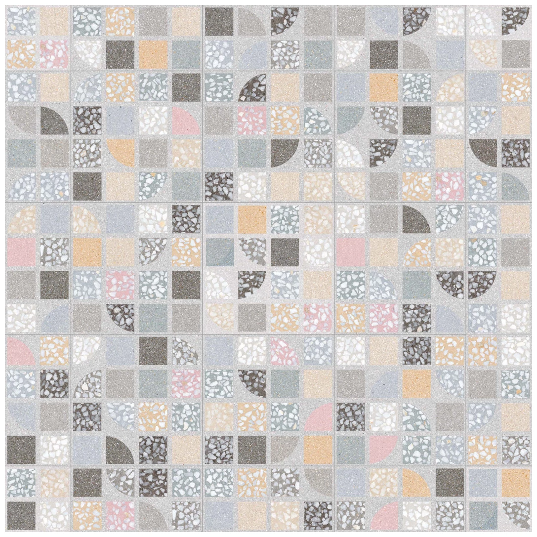 Quirinale-R Multicolor to gres patchwork na podłogę, który zwraca uwagę zestawieniem prostych, geometrycznych form. Płytka o wymiarze 29,3x29,3 cm prezentuje różne fragmenty wzorów w układzie delikatnej mozaiki. Całość utrzymana jest w stonowanej palecie: od szarości, beżu, przez jasne błękity, aż po miękki róż i brązy. Matowa powierzchnia zapewnia subtelność wykończenia, która zapobiega nadmiernemu odbijaniu światła, co jest praktyczne w codziennym użytkowaniu podłogi.