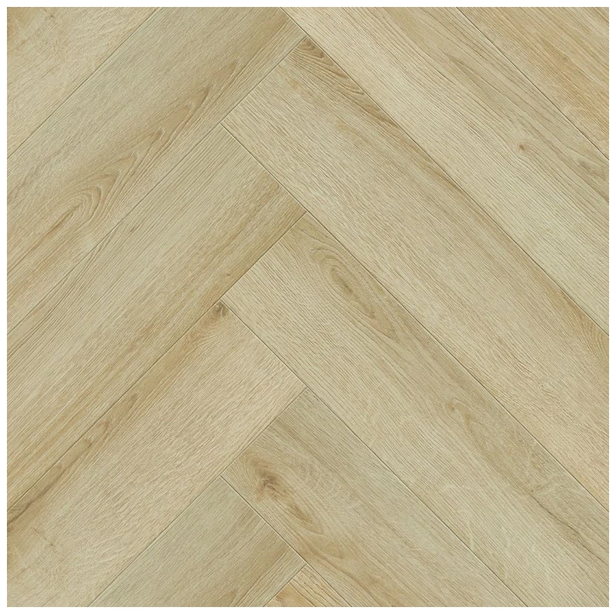 Jasna, naturalna tonacja drewna widoczna w tym wzorze to klasyczne dąbowe wykończenie w wersji jodełki. Panele mają wyraźne sęki i słojowanie, powierzchnia sprawia wrażenie matowej, stonowanej i przemyślanej. Format listew i układ jodełkowy dodają przestrzeni rytmu - nie jest to jednolity klepka, a uporządkowany, ale żywy wzór podłogi.