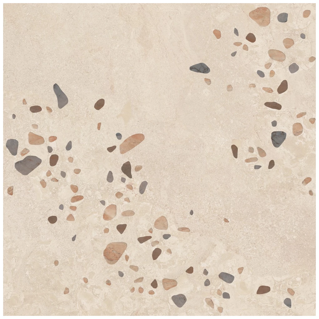 Płytka Awen Sand dekor 90x90 z kolekcji Harmony Awen to gres dekor o nieskomplikowanym, ale atrakcyjnym wzorze. Utrzymana w jasnej, piaskowej tonacji, z delikatnie rozmieszczonymi niewielkimi elementami w odcieniach ziemi - brązów i szarości. Ten układ sprawia, że powierzchnia jest ciekawa, lecz nie przytłacza. Matowe wykończenie dodatkowo potęguje stonowany charakter płytki, eliminując odbicia światła i nadając wnętrzu bardziej współczesny wygląd.
