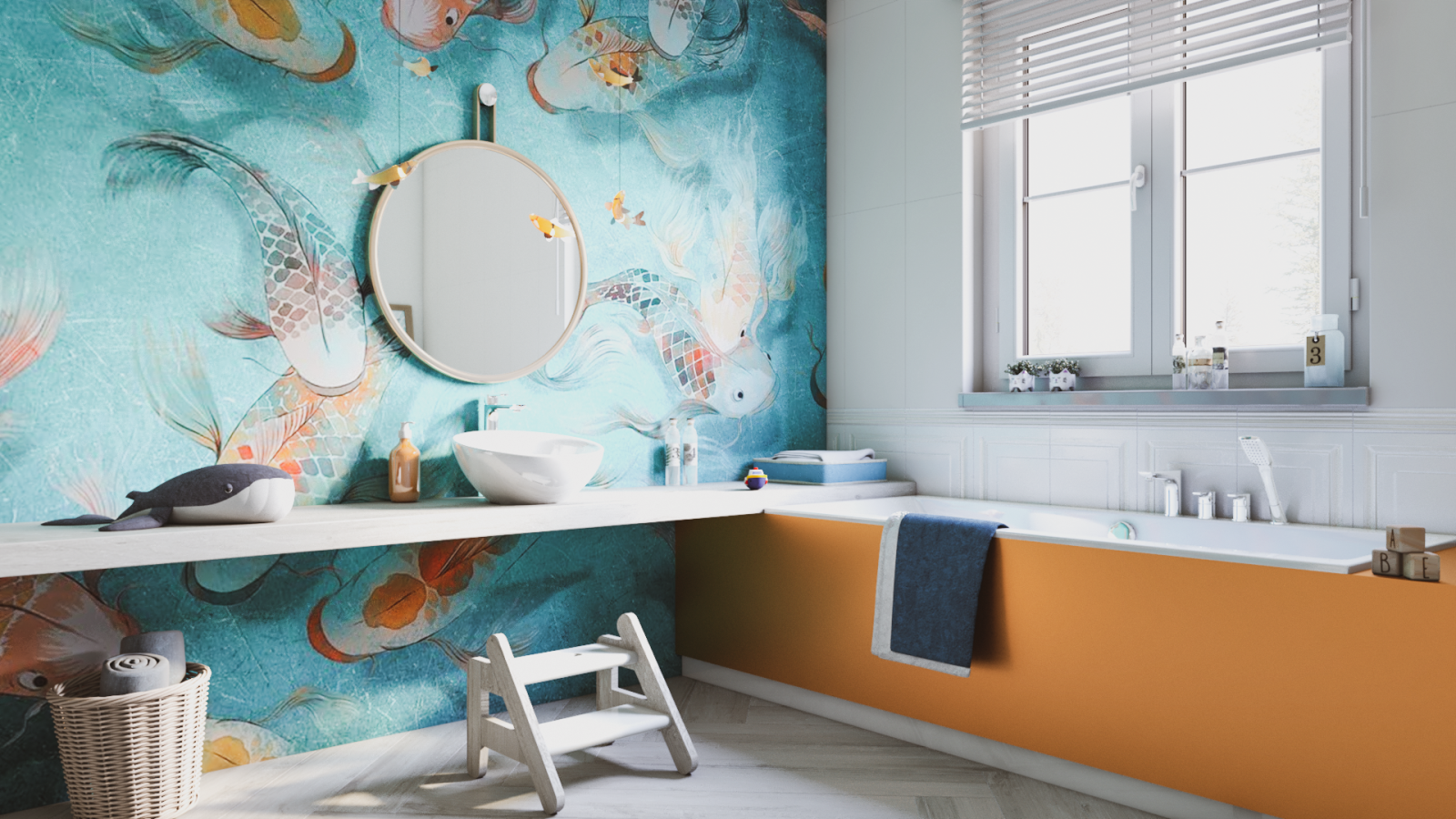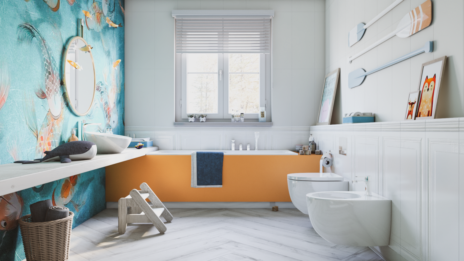 Kolorowa łazienka dostosowana do potrzeb małego dziecka.